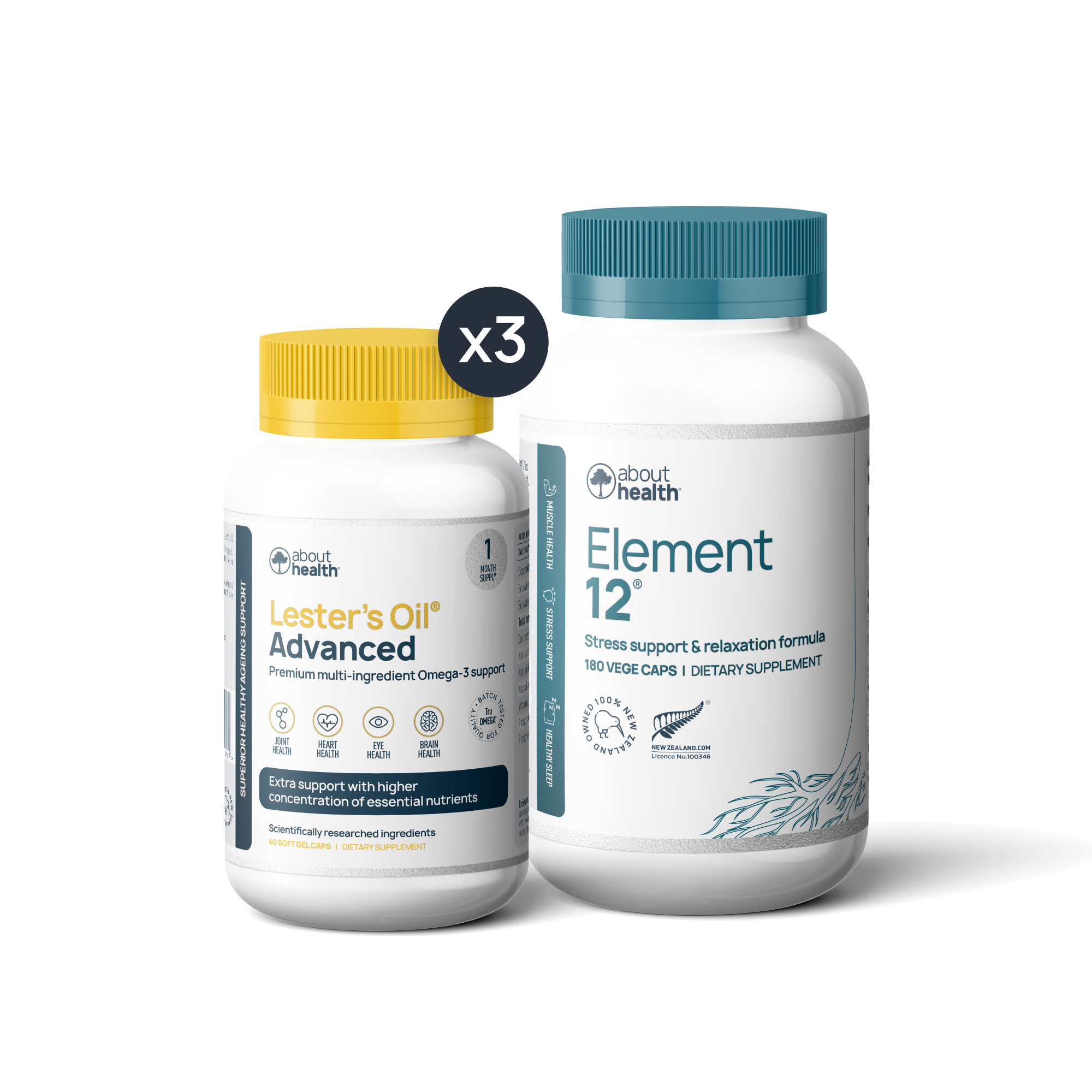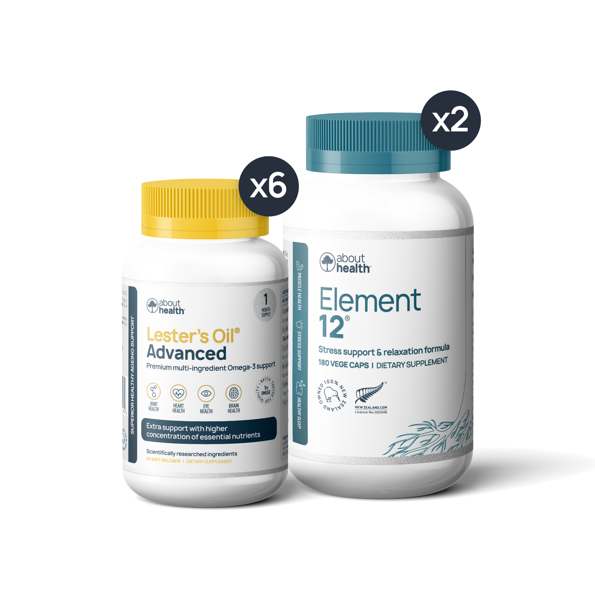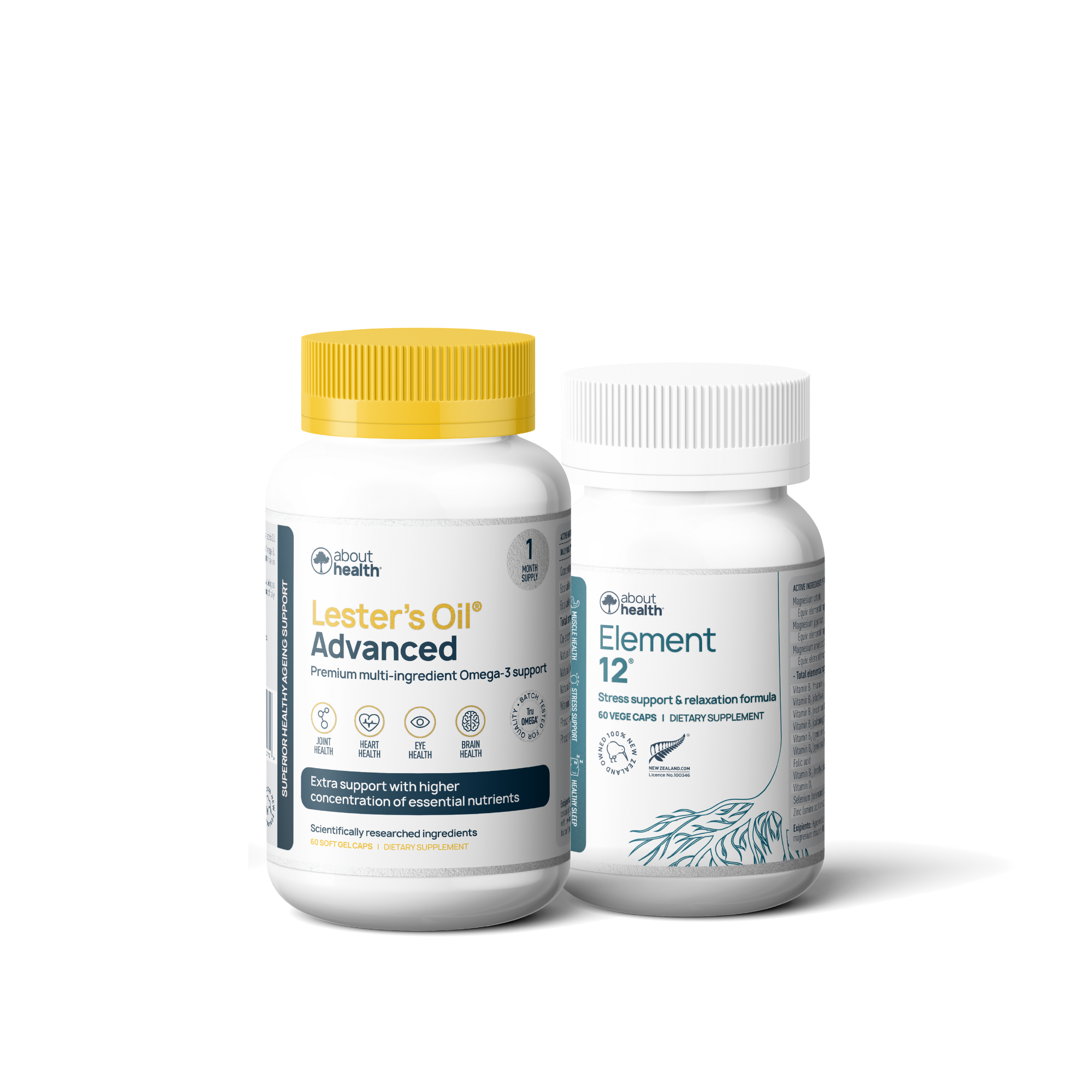 We designed this pack for people who want to move comfortably, think clearly, and feel energised every day. Lester’s Oil Advanced provides omega‑3s, phospholipids, and vitamin D3 to support joint mobility, heart health, and cognitive function, while Element 12 delivers magnesium, B-vitamins, and minerals for muscle relaxation, nerve support, and restorative sleep. Together, they give you a complete day-to-night solution, so you can stay active, recover well, and maintain vitality, without juggling multiple supplements or missing key nutrients.