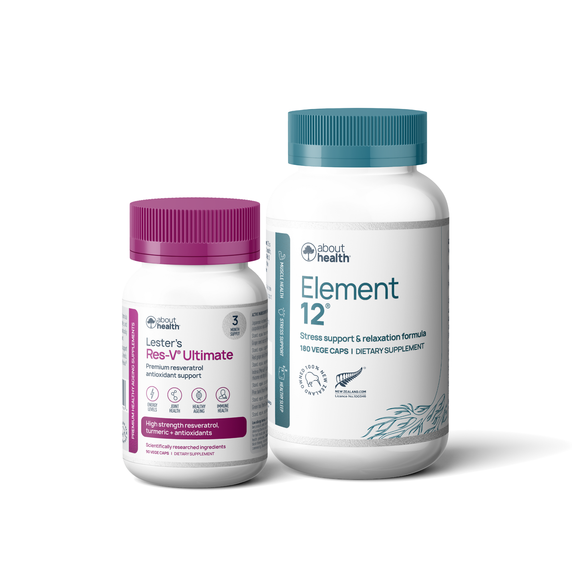 Res-V Ultimate and Element 12 work together to support healthy ageing by helping your body stay energised, resilient, and well-rested. Res-V Ultimate provides a powerful blend of antioxidants to support vitality and general wellness, while Element 12 delivers three highly absorbable forms of magnesium to assist with relaxation, stress response, and more restful sleep.