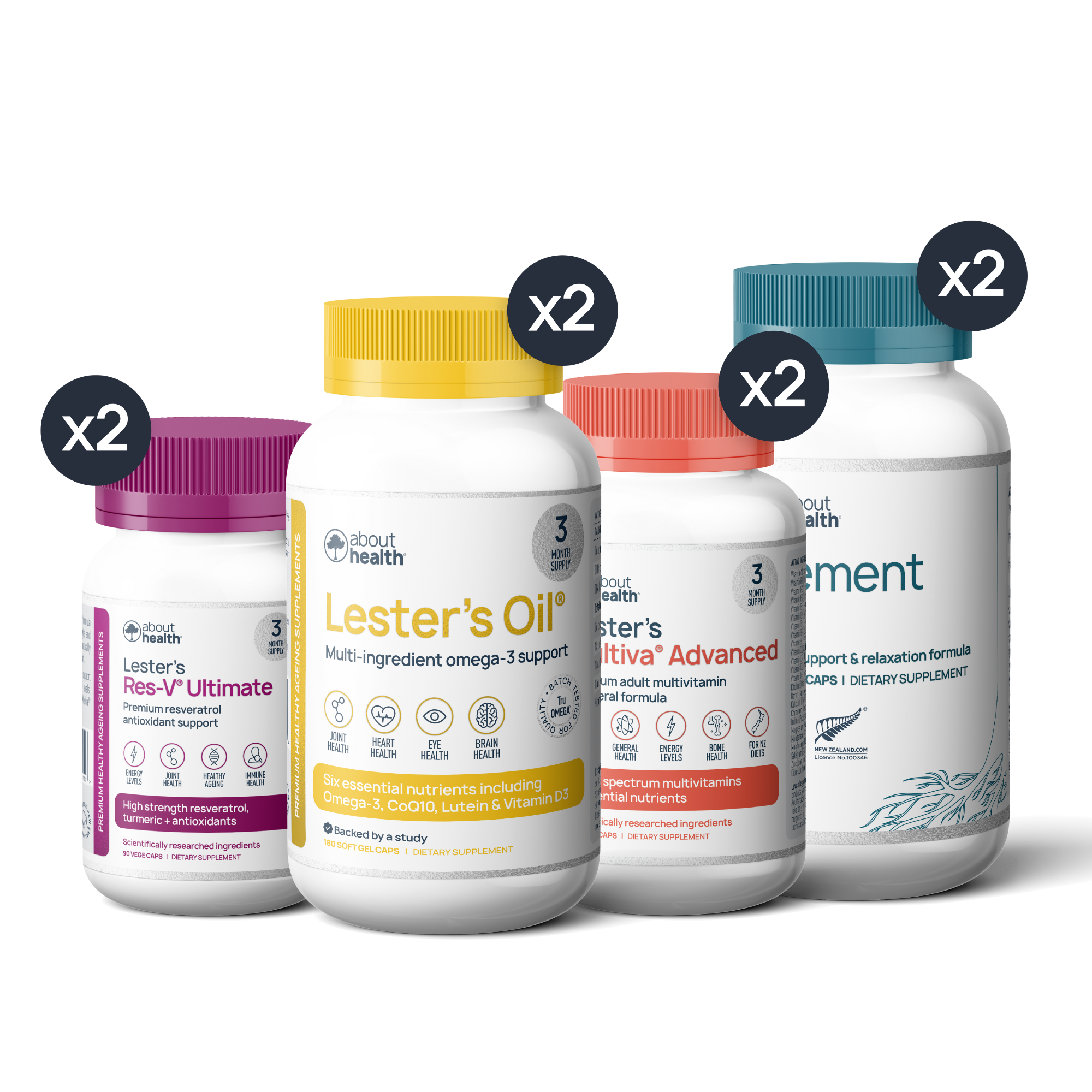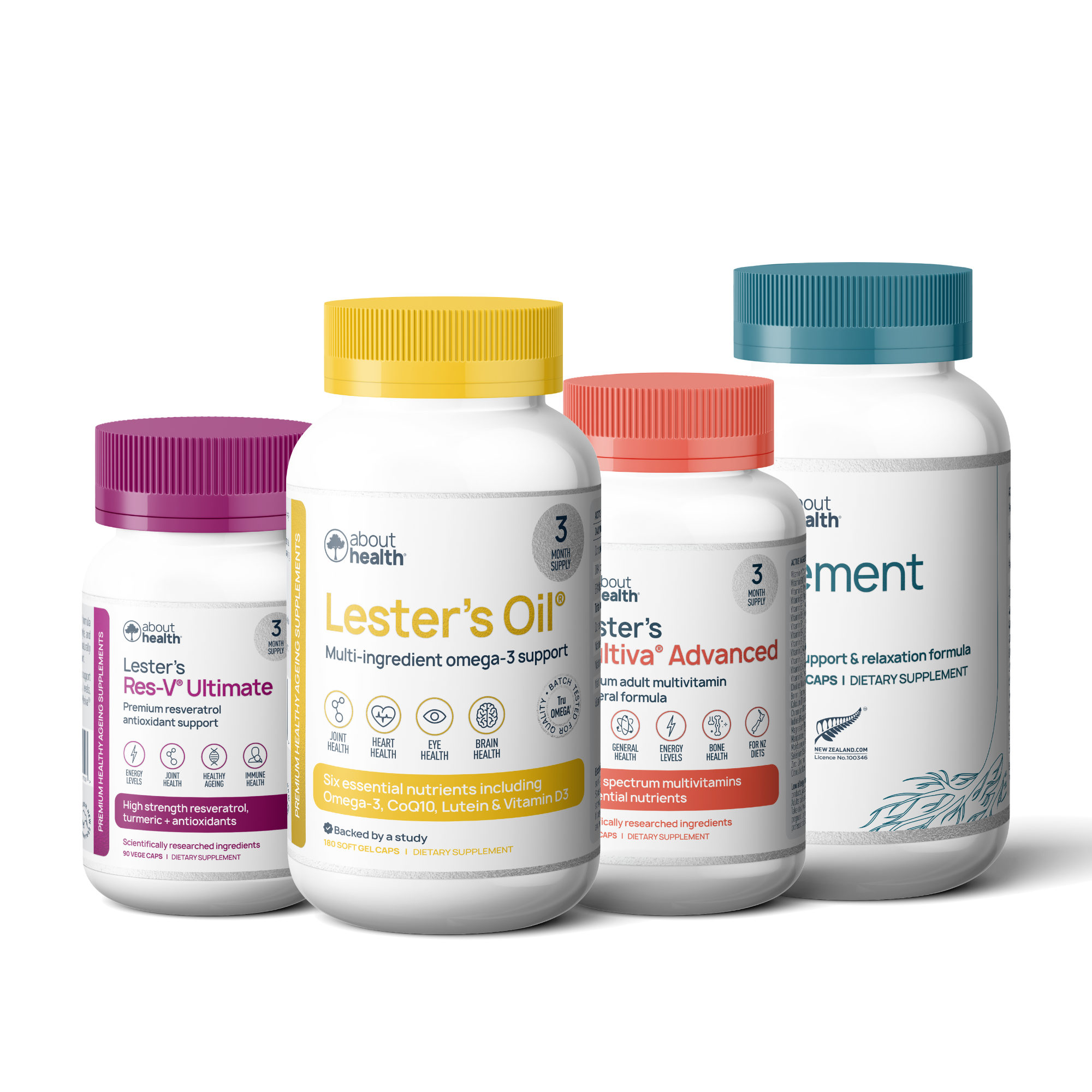 The Total Wellness & Sleep Pack includes four key supplements for everyday vitality and restful sleep: Lester’s Oil, Res-V Ultimate, Multiva Advanced, and Element 12 Magnesium. Lester’s Oil supports heart, brain and joint health; Res-V Ultimate provides antioxidant support for healthy ageing; Multiva Advanced helps maintain daily energy and nutrient balance; and Element 12 Magnesium supports relaxation and deeper sleep. Together, they offer a simple, all-in-one routine for overall wellness.